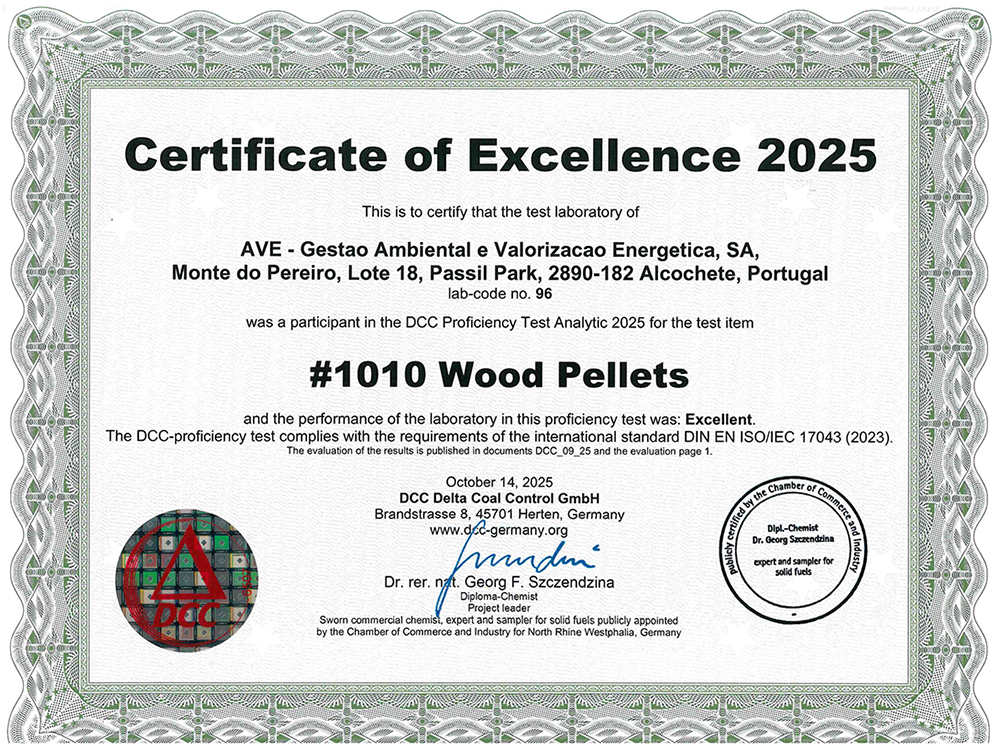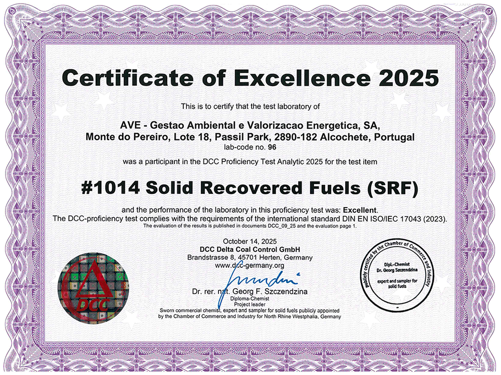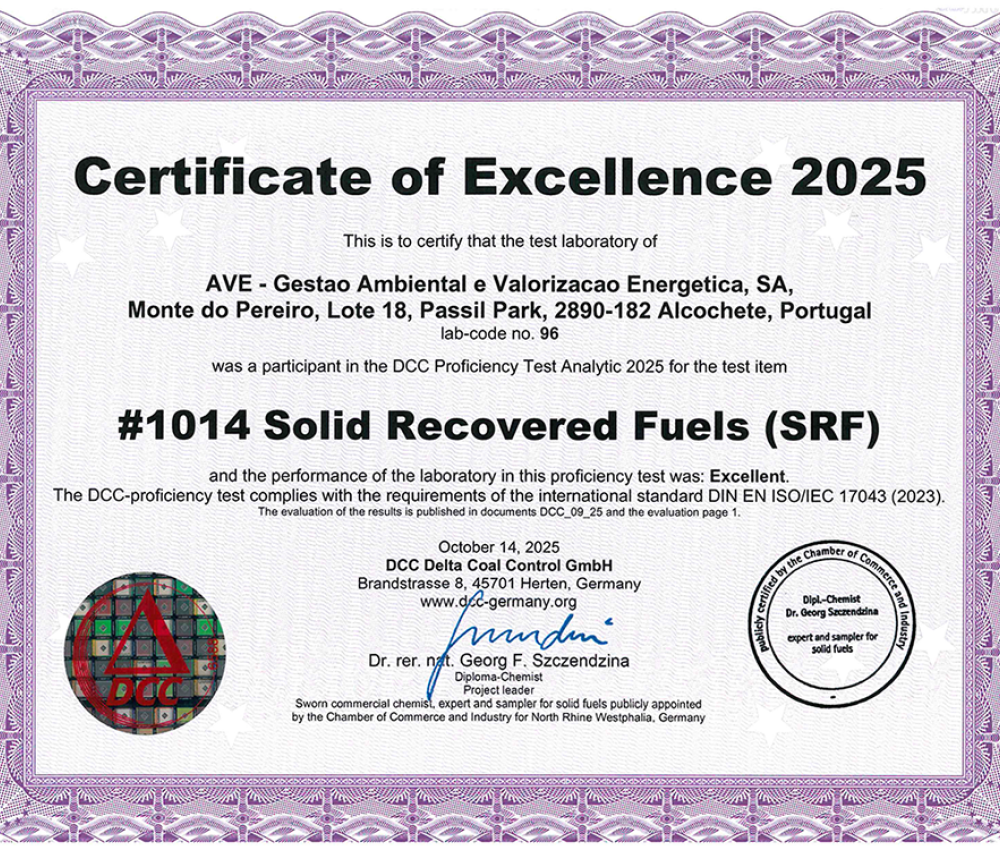 O Laboratório da AVE voltou a alcançar, em 2025, o grau máximo de classificação “Excellent” no ensaio interlaboratorial mundial promovido pela DCC Delta Coal Control GmbH, na análise a Combustíveis Derivados de Resíduos (CDR), pelo sexto ano consecutivo, reforçando a consistência e a precisão dos resultados obtidos em diferentes parâmetros analíticos.